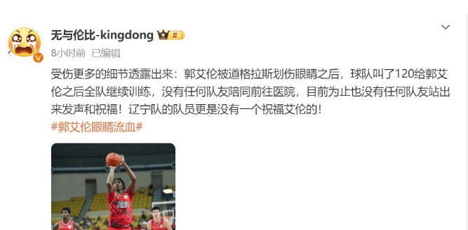 而有一名叫做“无与伦比”的网友爆料了郭艾伦受伤的细节,他称是外援道格拉斯划伤了郭艾伦的眼睛,随后球队打了120,接下来全队没有停止训练,也没有任何队陪同郭艾伦前往医院,而目前也没有任何队友为郭艾伦发声并送上祝福。这名网友一看就是郭艾伦的铁杆粉丝,他认为道格拉斯应该立刻出来给郭艾伦道歉,龙狮俱乐部也不该装死。而且,道格拉斯这个伤人行为已经构成了故意伤害。