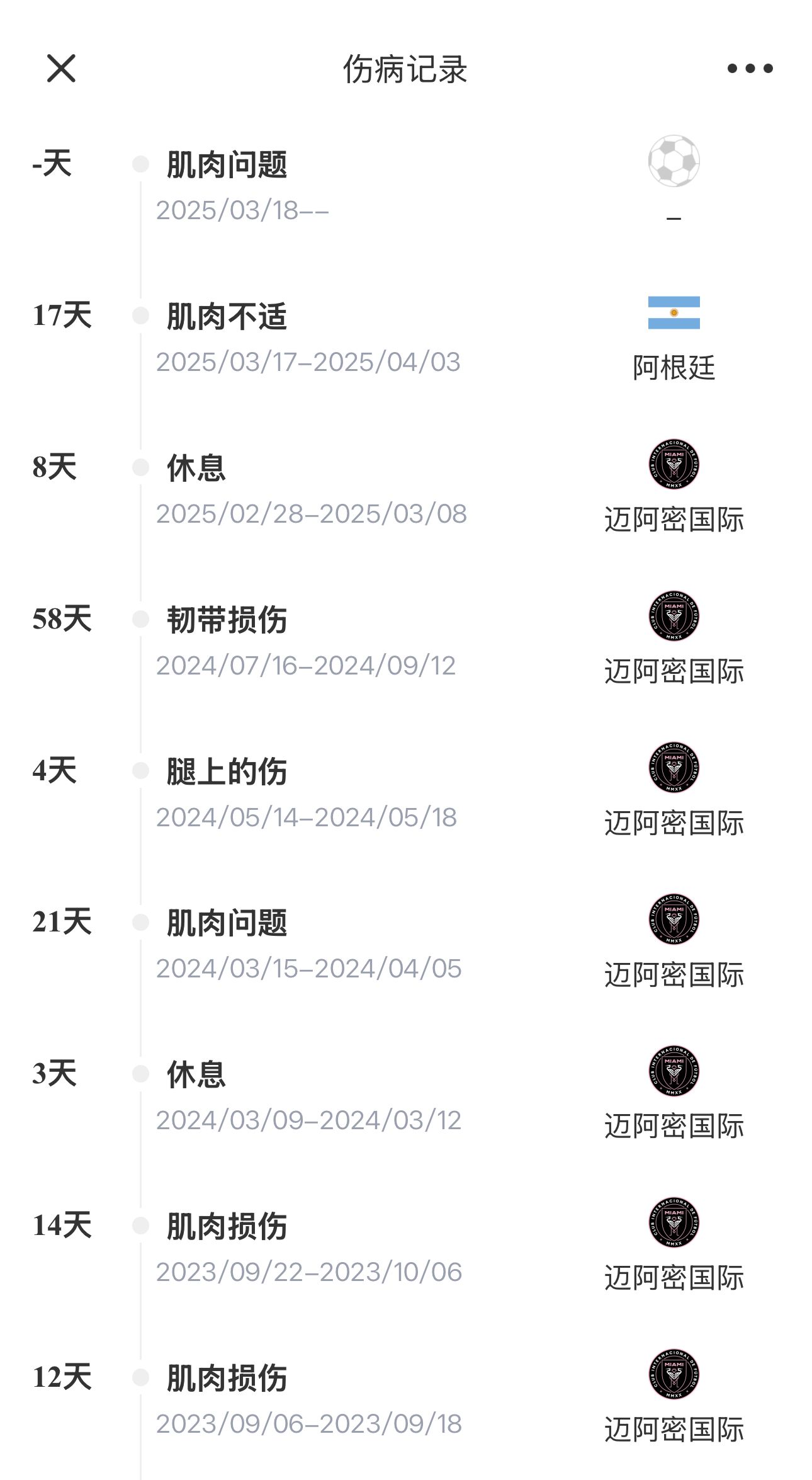 江城足球网03月18日讯 阿根廷官方公布本期世预赛名单,37岁梅西因伤缺席,无缘对阵乌拉圭和巴西。迈阿密国际官方公布伤情,梅西内收肌轻度损伤。