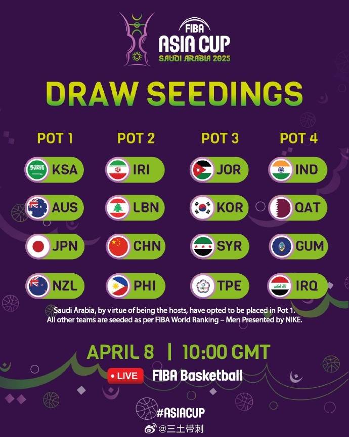 男篮亚洲杯分档出炉:中国男篮第二档 日本第一档