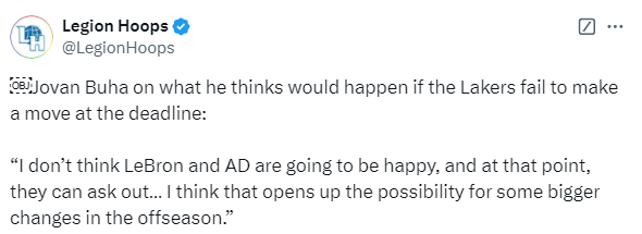 湖人跟队记者Buha报道称:如果湖人本赛季没有任何交易发生,詹姆斯和浓眉都不会高兴,到那个时候,他们可能会要求交易。我们将看看剩下的赛季如何发展,他们能否以某种方式打出一波连胜,或许超出预期,这也许能平息一些因为没有做出交易而产生的挫败感或愤怒。否则,我认为这将为休赛期的一些重大变动打开了可能性。