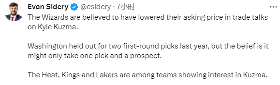 据美记者Evan Sidery报道,奇才已经在库兹马的交易谈判中降低了要价;去年,奇才坚持索要两个首轮签,但现在可能只需要一个选秀权和一个潜力球员。