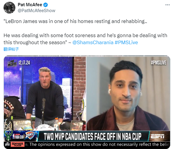 谈到詹姆斯此前离队原因,名记Shams在节目中表示:“我确信雷迪克知道勒布朗-詹姆斯在哪里,我来透露一些消息,勒布朗(那段时间)待在了家里——不清楚是位于哪里的房里,他在全世界有很多房子,只是在休息和恢复,让自己的身体恢复正常。”