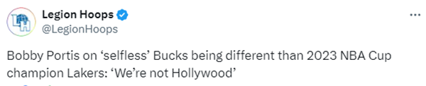 谈到去年杯赛冠军湖人和今年杯赛冠军雄鹿的区别,波蒂斯表示湖人和雄鹿没有可比性,直言:我们不是好莱坞,我们有一群努力且无私的球员,大家都愿意为团队的进步做出自己的牺牲。重要的不是你自己得了多少分,重要的是球队的胜利、团结。我们的团队和他们不同,不同之处在于我们更乐于无私奉献;你没法去比较这两支球队,根本没有可比性。