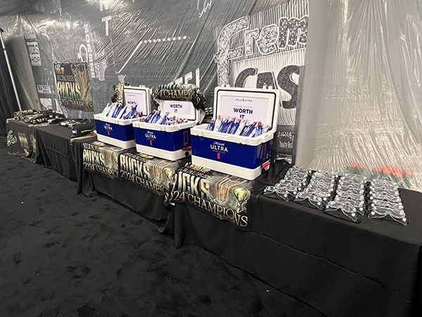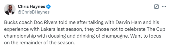 去年夺得杯赛冠军后,湖人曾在更衣室喷香槟庆祝,当时詹姆斯戴着护目镜狂喷香槟庆祝;今年雄鹿夺得杯赛冠军后拒绝喷香槟庆祝;据名记Chris Haynes报道,主帅里弗斯透露,在与哈姆交流讨论上赛季在湖人的经历后,雄鹿决定不开香槟庆祝,他们希望集中精力在本赛季的剩余比赛上。