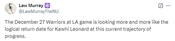 快船随队记者Law Murray发推表示,就目前的康复进展轨迹来看,12月28日主场迎战勇士的比赛越来越像是莱昂纳德复出的合理日期!