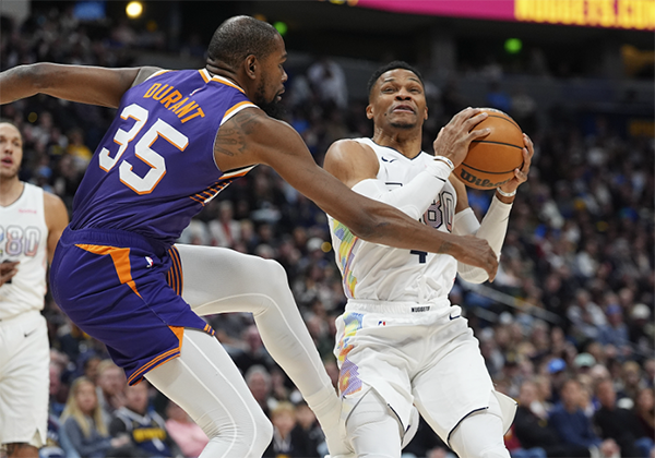 约基奇三节17投12中、三分6中4拿到32分7助攻2篮板,打爆努尔基奇;威少贡献11分7助攻5篮板2抢断,第三节9分助掘金一波流拉开分差。