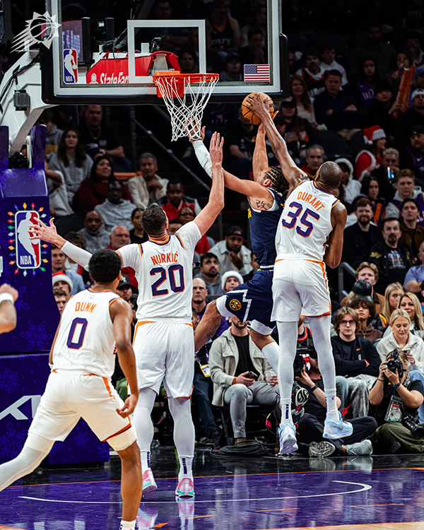 下半场,太阳第三节在攻防两端都压制掘金,单节27-22赢5分,这一节掘金全队出现多达6次失误,比尔抢断反击以及禁区大帽布劳恩太强硬;这一节杜兰特贡献9分,约基奇5分5篮板0助攻。
