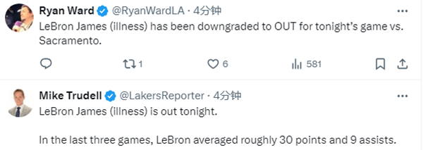 此前詹姆斯因生病缺席了球队的训练,并且因生病被列为出战成疑,今日赛前,湖人跟队记者报道,詹姆斯今日因病缺战国王,这是詹姆斯本赛季第3次缺席比赛,此前两次缺席,湖人1胜1负。