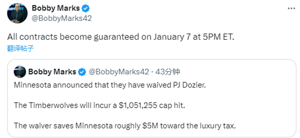 据薪资专家Bobby Marks报道,多齐尔的合同将在1月8日受到完全保障,森林狼此举释放了105万1255薪资空间,节省了大约500万美元的奢侈税。