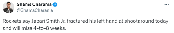 江城足球网讯北京时间1月4日,休斯顿火箭惨遭伤病打击,据名记shams报道,火箭新星小贾巴里-史密斯在投篮训练时遭遇左手骨折的伤病,预计伤停4-8周,将接受手术。