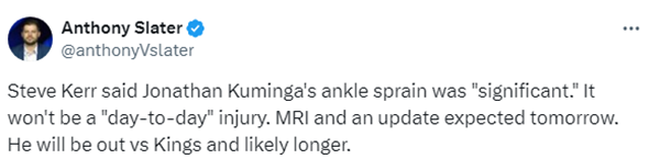究竟库明加的伤势如何?赛后勇士主教练科尔透露,库明加的脚踝扭伤很严重,这不是一个每日观察的伤病;当明天核磁共振结果出来后,球队会知道更多详情,他将因伤缺席明天与国王的比赛,可能缺席很长一段时间。