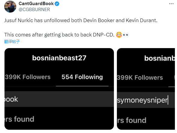 努尔基奇不仅因病缺席比赛,而且将暂时离开球队;由于在场上的表现十分糟糕而且防守态度消极,努尔基奇已经连续2场被弃用,彻底掉出了轮换;据悉,努尔基奇已经在Ins上取关杜兰特和布克,很明显,努尔基奇对自己的处境十分生气,他也知道球队正在交易自己。