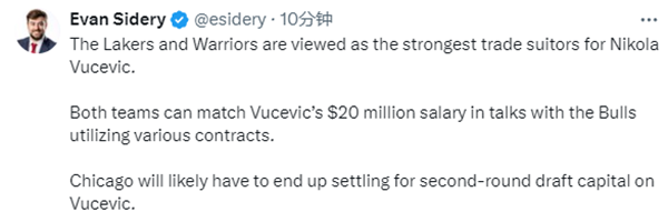 江城足球网讯北京时间1月13日,据美记者Evan Sidery报道,目前湖人和勇士被视为是中锋武切维奇的最强追求者,两队都能用资产配平武切维奇2000万美元的合同,公牛最终可能只能用武切维奇换来二轮签的筹码。