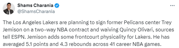 优直播讯 北京时间1月16日,湖人开始裁员了,据名记Michael Scotto报道,湖人已经裁掉了双向合同球员奥利瓦里,预计他将在自由球员市场吸引其他球队的兴趣;shams进一步报道,湖人裁掉奥利瓦里是为了签下鹈鹕中锋特雷-杰米森,杰米森能为湖人提升内线。
