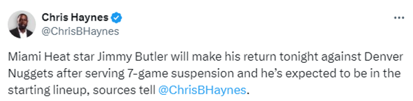 据报道,昨天巴特勒和热火老板会面,今日名记报道巴特勒确定今日解禁复出并且首发出战,之后巴特勒官宣复出;不过Ramona Shelburne报道更多巴特勒与热火闹剧的细节。