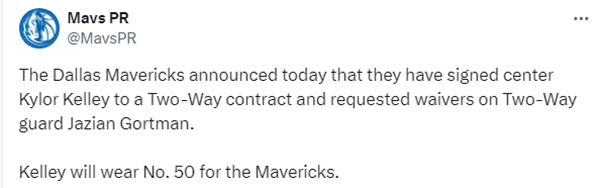 江城足球网讯 北京时间1月27日,由于遭遇伤病打击,独行侠官方宣布一裁一签,裁掉双向合同后卫贾齐安-戈特曼,然后用双向合同签约中锋凯勒-凯利,后者将身穿独行侠50号球衣。