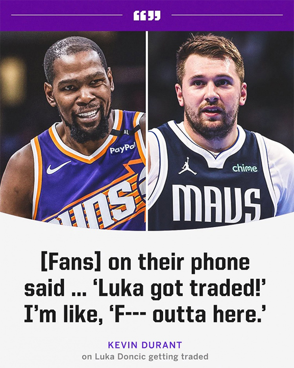 杜兰特透露,他是从球迷那里得知交易消息的,随后一名保安用手机给他看了Shams的报道;杜兰特还表示:球迷们当时说‘卢卡被交易了。’我的反应是,‘滚吧。