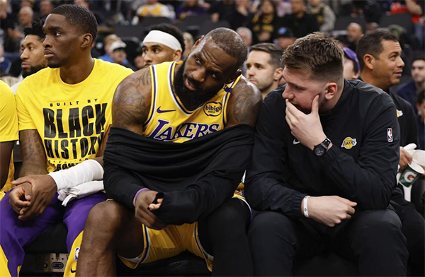 东契奇坐在湖人替补席观战,为海斯的暴扣而兴奋庆祝;老詹休息时,他与东契奇并肩坐在一起,两人有说有笑十分轻松。