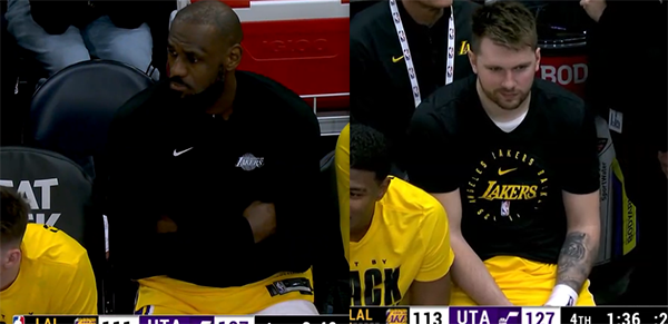 湖人客场119-131爆冷不敌爵士,湖人下半场突然崩盘,东契奇第三节吃到5次犯规,詹姆斯末节带队反抗却无济于事,比赛还剩7分44秒湖人提前认输;垃圾时间,布朗尼表现出色,但老詹明显开心不起来,东契奇落寞以及苦笑,赛后老詹与东契奇简短交流后离场返回更衣室。