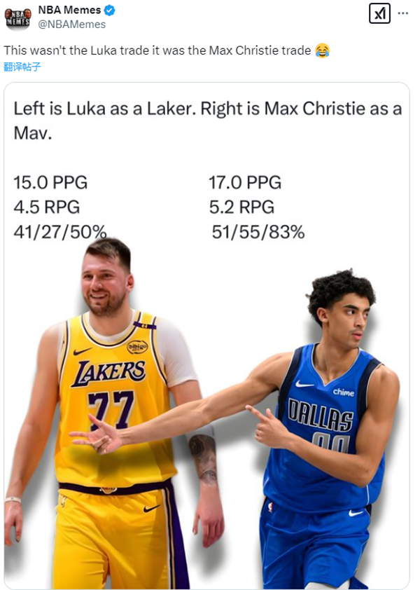 江城足球网讯湖人旧将马克斯-克里斯蒂的出色表现引热议,自从被交易之后,22岁的克里斯蒂在独行侠队场均拿到17+5且效率很高,离开湖人后多项数据暴涨,美媒调侃东契奇才是交易添头。