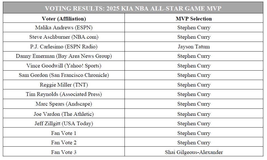 最终,库里获得了14票中的12票,以绝对优势当选今年旧金山AMVP,拿下科比杯,职业生涯第二次当选全明星MVP。
