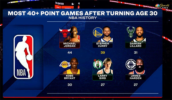10、库里30岁后第9次单场50+,刷新历史第一纪录,张伯伦7次历史第二,利拉德和乔丹6次,哈登5次做到。