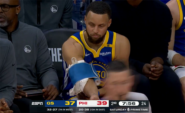 末节勇士落后到10分后疯狂反扑,库里带队一波13-3扳平比分,期间库里在反击中单臂劈扣,这是库里时隔6年首次在比赛中扣篮,库里罕见劈扣点燃替补席;关键时刻,库里助攻串联队友,格雷姆斯和亚布塞莱连续得分强势回击,最后1分31秒勇士116-121落后5分,暂停回来费城包夹库里,桑托斯打成关键2+1,之后追梦防守犯规,格雷姆斯三罚一中,勇士已经没有暂停还连丢篮板,乔治制胜一击,库里错失续命三分,最终勇士客场爆冷输球,5连胜被终结,而且让76人终结9连败。