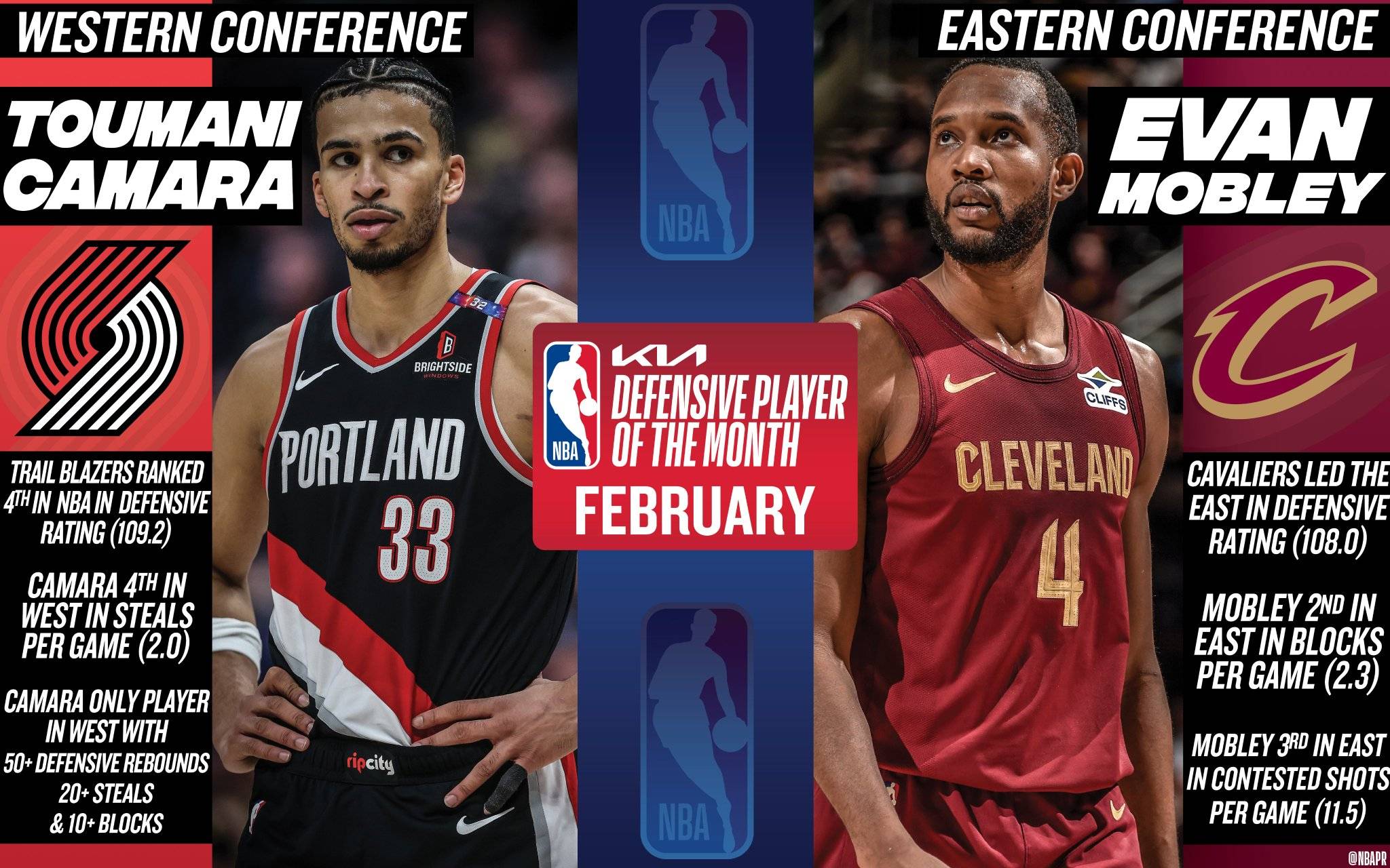 NBA官方宣布,骑士队的莫布利和开拓者队的图马尼-卡马拉当选2月东西部最佳防守球员。2月莫布利场均盖帽排在东部第2,场均干扰投篮次数位列东部第3。在此背景下,骑士队2月的防守效率排在东部首位。