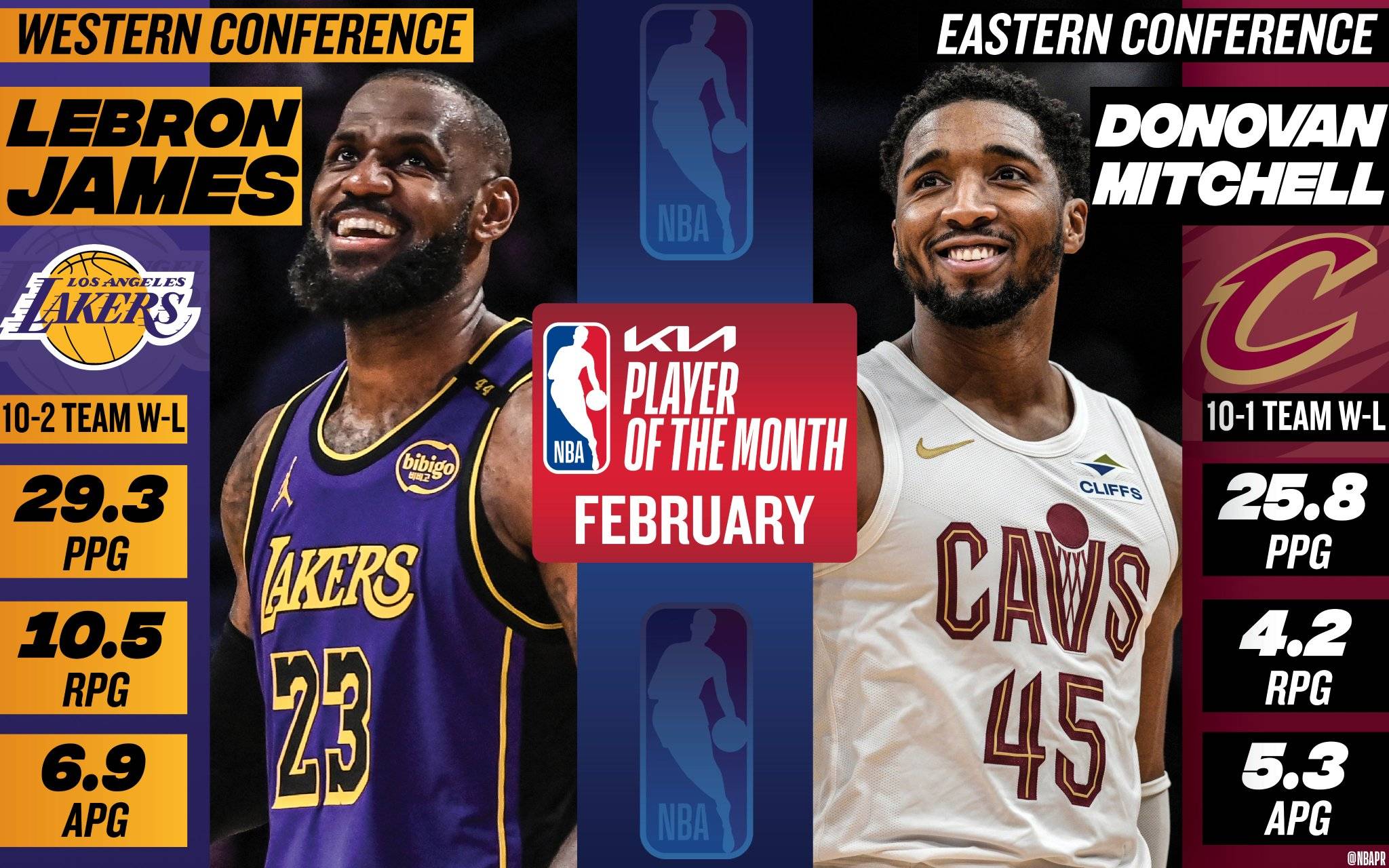 江城足球网 北京时间3月5日消息,NBA官方宣布,骑士队的多诺万-米切尔和湖人队的勒布朗-詹姆斯荣膺2月东西部最佳球员。