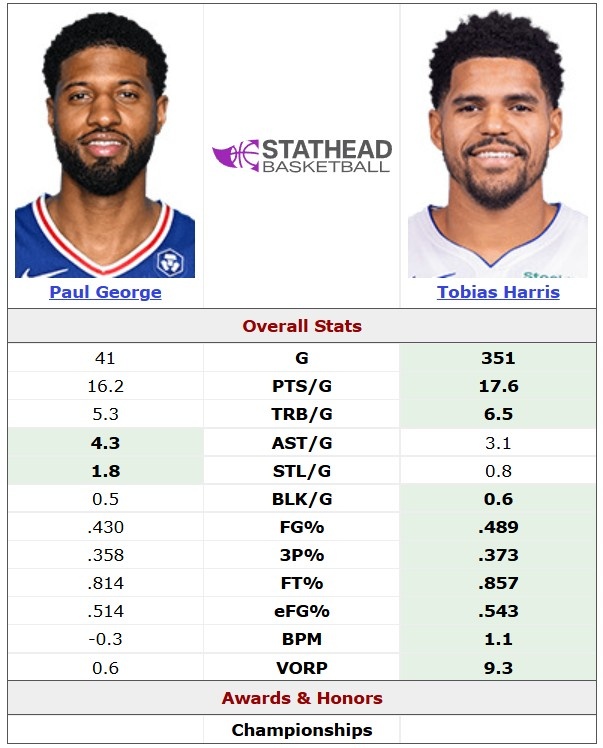 2019年休赛期,76人和托拜亚斯-哈里斯签下一份5年1.8亿美元的合同。在这份合同期间,哈里斯共计出场351次,场均出场33.7分钟,得到17.6分6.5篮板3.1助攻0.8抢断0.6盖帽,命中率48.9%,三分命中率37.3%,罚球命中率85.7%。