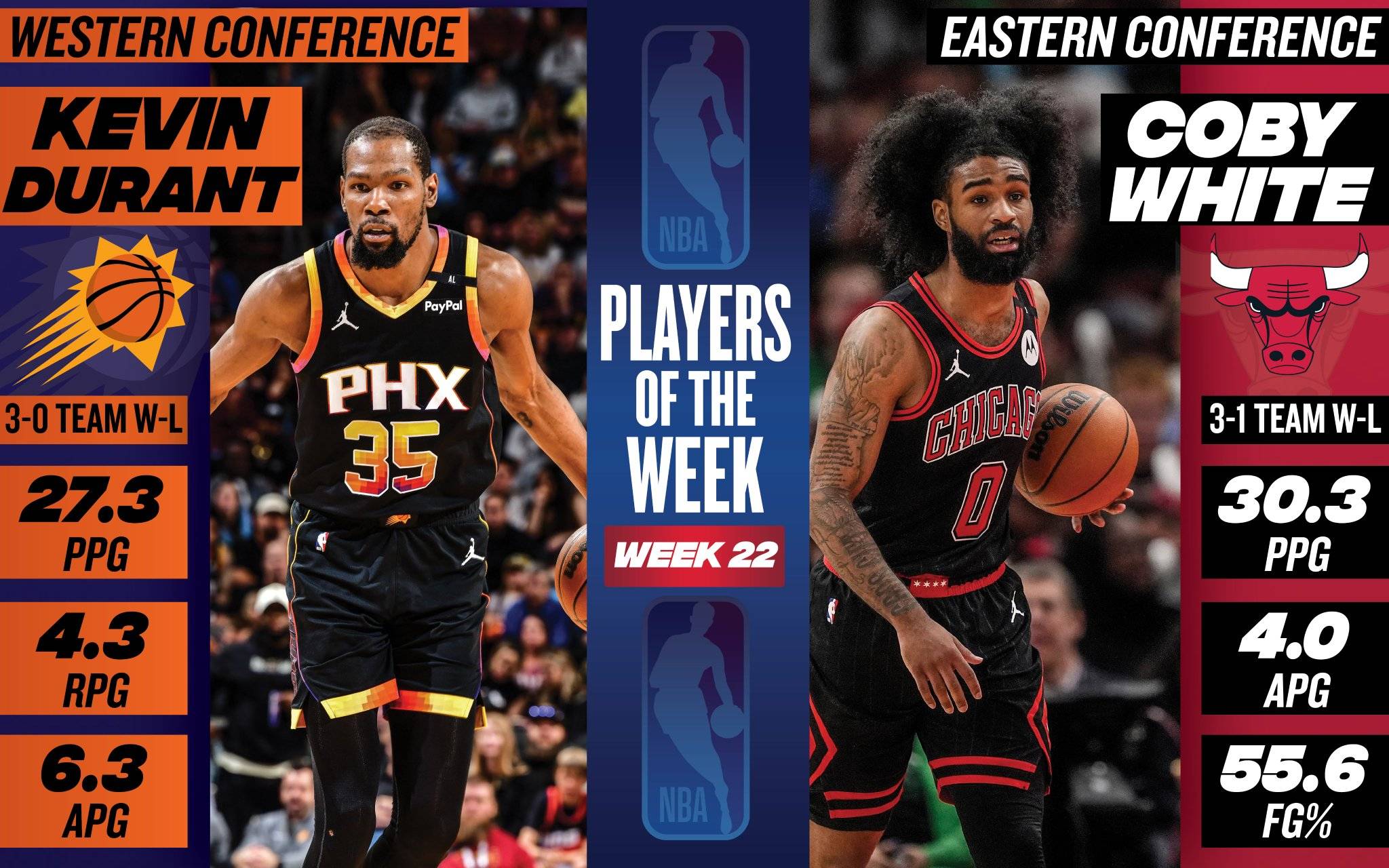 杜兰特上周场均有27.3分4.3篮板6.3助攻入账,三分球命中率47.1%,率领太阳队取得3胜0负的不败战绩。