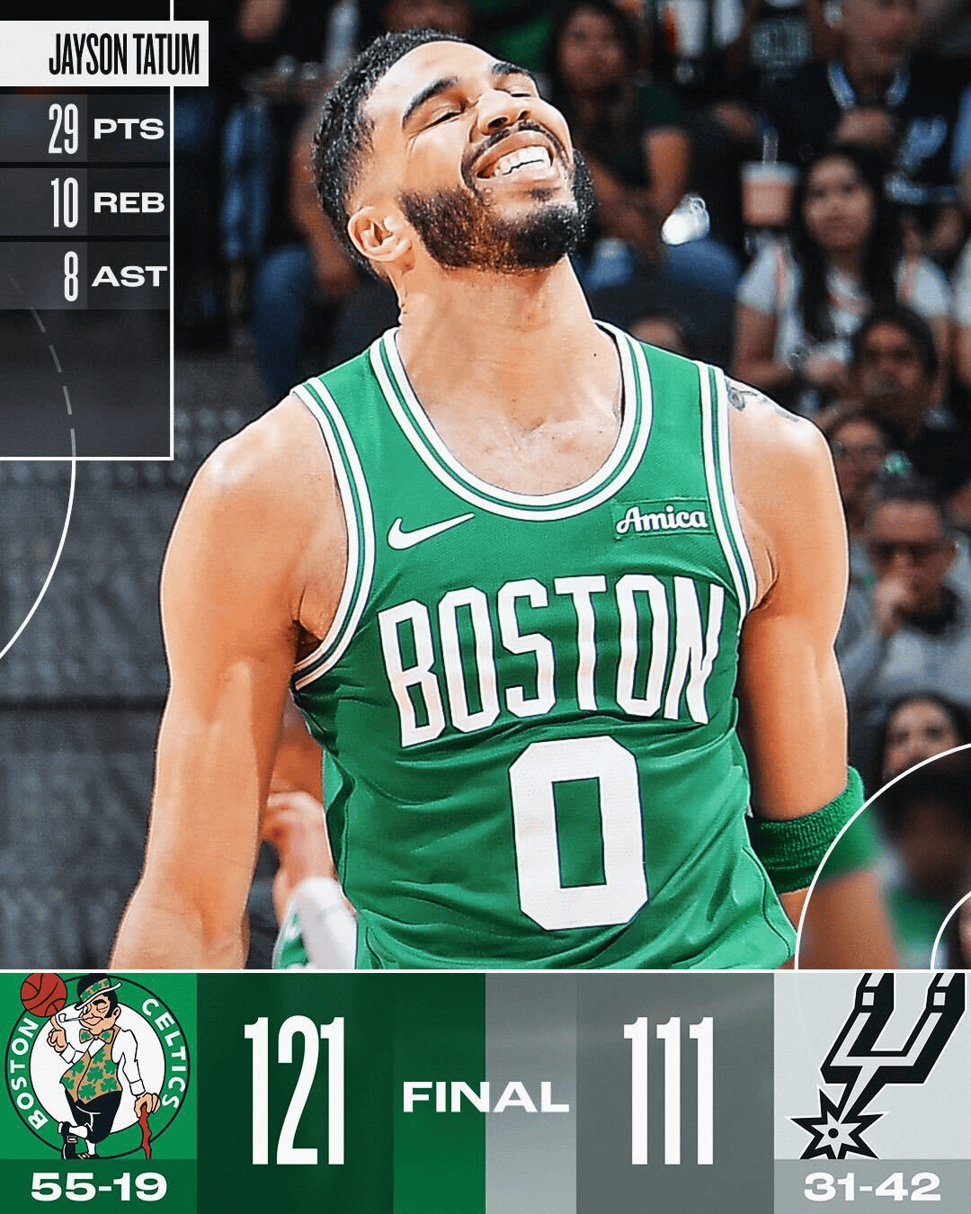 塔图姆29分10篮板8助攻,凯尔特人战胜马刺后,将连胜场数延续到8场,目前绿军和骑士之间的还有4个胜场差,两队各剩下8场比赛,绿军要想最后反超骑士,难度极大。