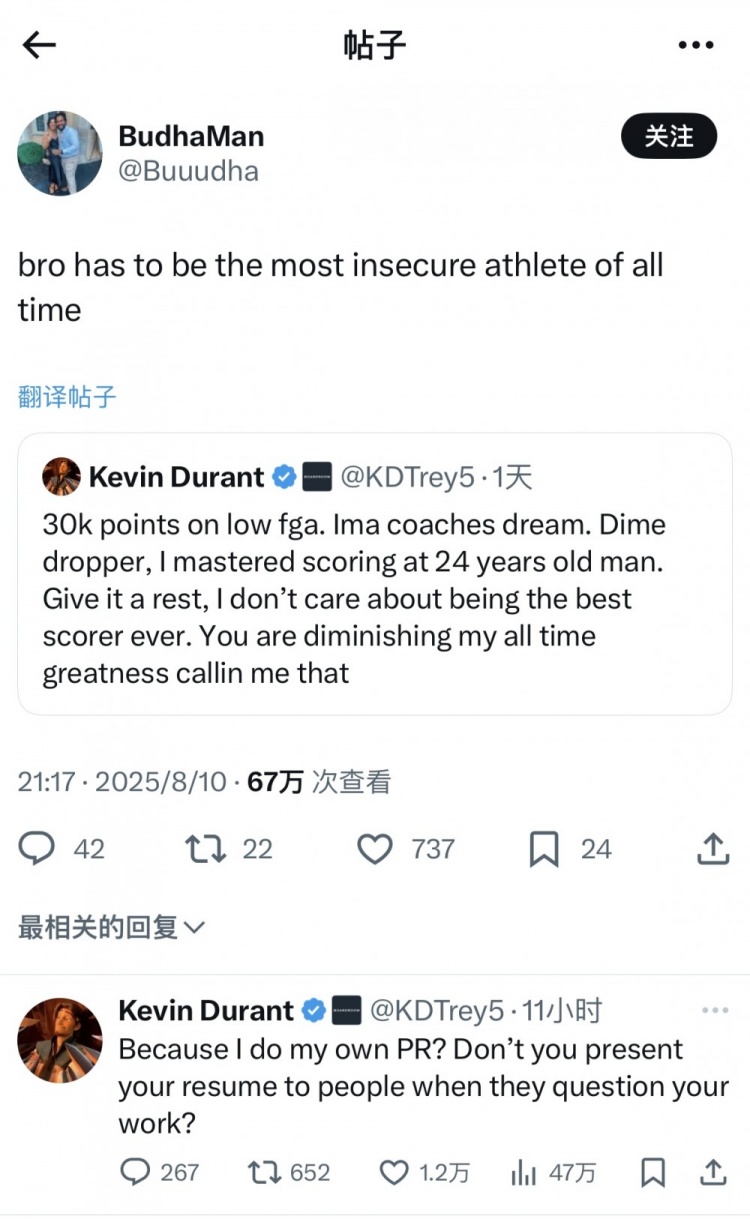 杜兰特:“我用较少的出手次数就得到了3万分,我是教练的梦想。Dime Dropper,我24岁时就已经掌握了得分技能。别再说了,我不在乎成为史上最佳得分手。你们这样称呼我是在贬低我的伟大。”