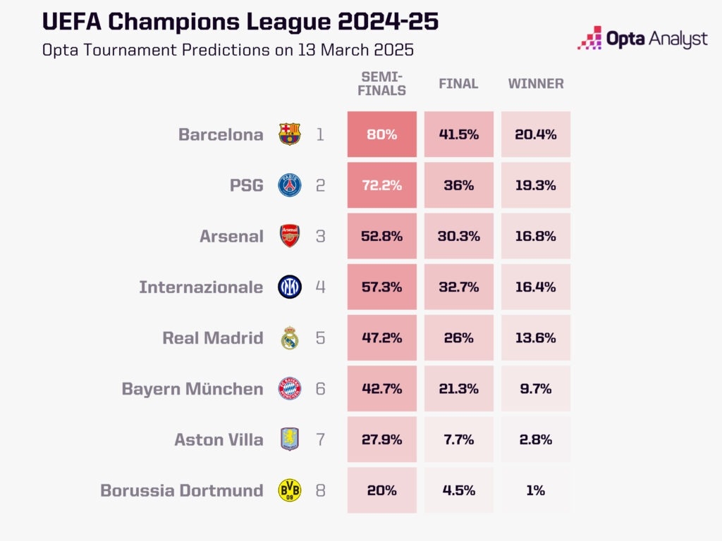 江城足球网03月13日讯 欧冠1/8决赛全部结束,opta也更新了最新的欧冠夺冠概率,其中巴萨以20.4%领跑,巴黎、阿森纳分列二三,国米、皇马和拜仁位列第4、第5和第6。