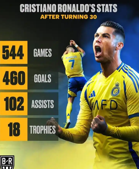 数据统计显示,C罗在30岁后效力过皇马、尤文、曼联和利雅得胜利,并仍为葡萄牙队效力,期间共计出战544场,贡献460球102助攻,随队赢得了18座冠军。