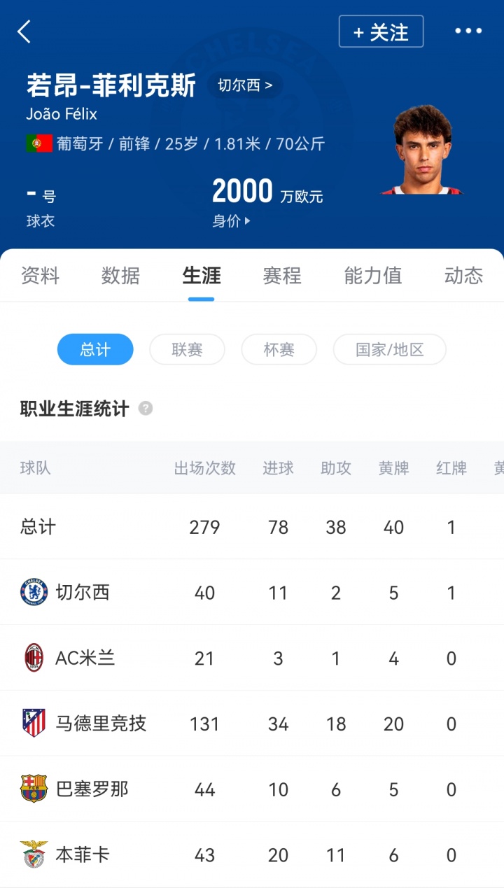 菲利克斯上赛季各项赛事出战了41场比赛,交出10球2助攻,目前他的德转身价为2000万欧。