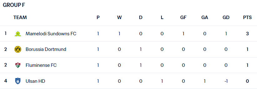 F组:蔚山HD0-1马梅洛迪日落、弗鲁米嫩塞0-0多特蒙德