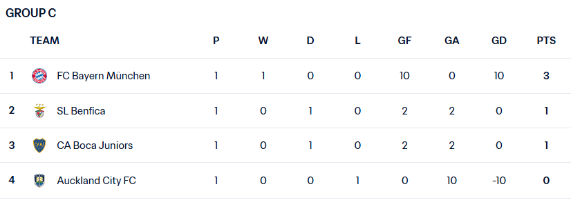 C组:拜仁慕尼黑10-0奥克兰城、博卡青年2-2本菲卡