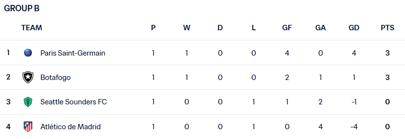 B组:巴黎圣日耳曼4-0马德里竞技、博塔弗戈2-1西雅图海湾人