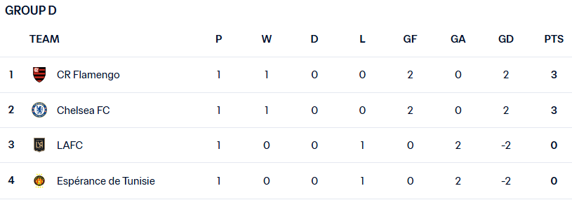 D组:切尔西2-0洛杉矶FC、弗拉门戈2-0突尼斯希望
