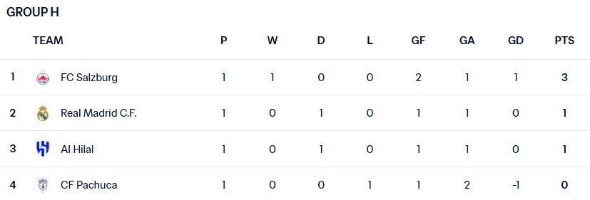 H组:皇家马德里1-1利雅得新月、帕丘卡1-2萨尔茨堡红牛