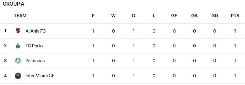 A组:迈阿密国际0-0开罗国民、帕尔梅拉斯0-0波尔图