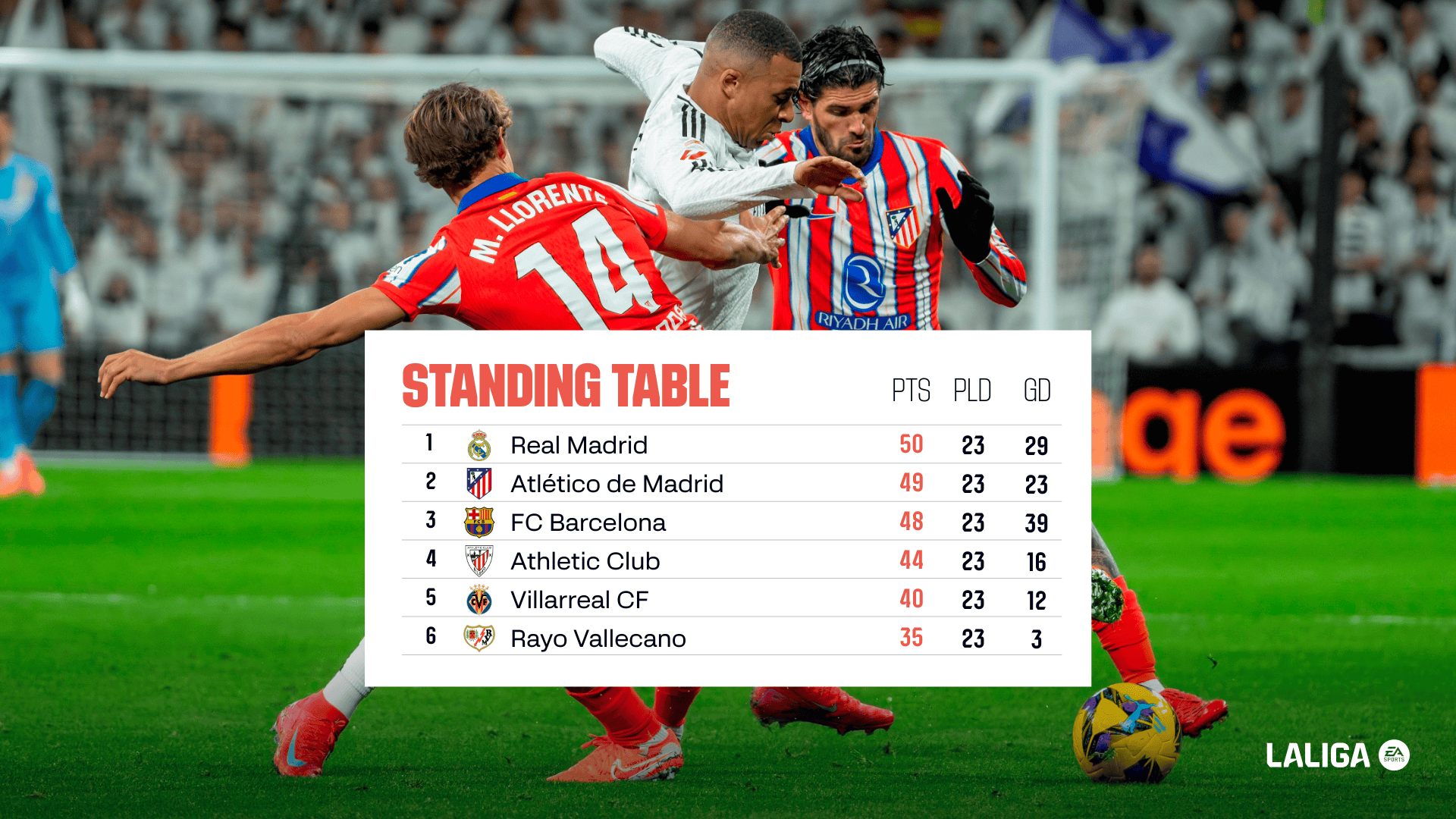 西甲前三名球队目前分别积50分、49分和48分,争冠形势愈发激烈,这在欧洲各主流联赛中绝无仅有;排名第四的毕尔巴鄂积44分,23轮过后与榜首仅差6分,同样处在争冠队列中