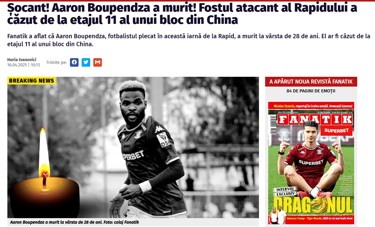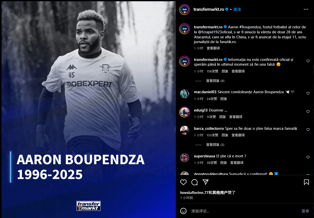 FANATIK在报道中称:前罗马尼亚超级联赛最佳射手阿隆·布彭扎在中国从11楼坠落身亡。目前,布彭扎的死因仍在调查中,根据FANATIK获得的信息, 中国警方正在追查三种可能的情况:自杀、意外坠楼和他杀。第一个可能是布彭扎自杀。第二种可能则是意外坠落。与此同时,调查人员推测的第三种可能则是他的兄弟也在公寓里,并且发生了争吵。调查人员正在调查争吵是否可能导致布彭扎坠楼。作为调查的一部分,他的兄弟预计将接受询问或被拘留。