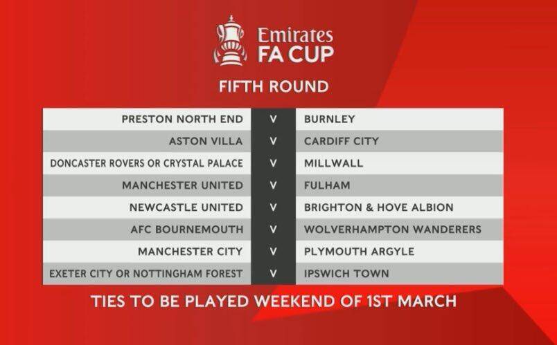 北京时间2月11日消息,本赛季足总杯16强战抽签出炉,曼联将对阵富勒姆,曼城将对阵淘汰了利物浦的普利茅斯,纽卡斯尔与布莱顿上演“英超内战”。